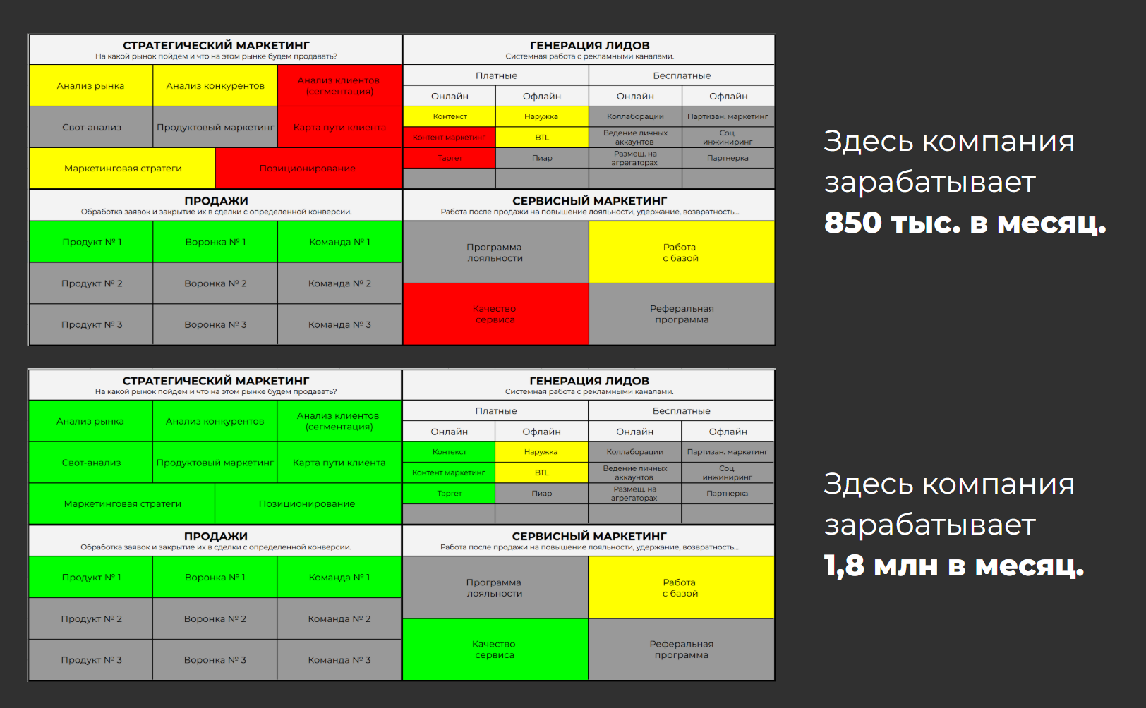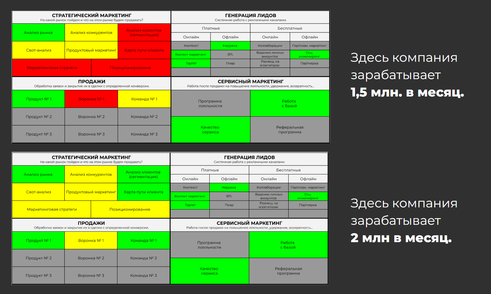 Проведите анализ каждого из 4 разделов вашей системы маркетинга. Определите, что сейчас работает, где красные зоны. Поймите, что делать, чтобы маркетинг стал результативным.