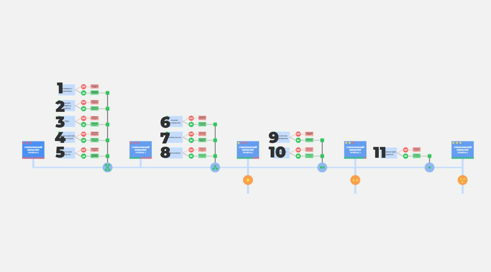 3. Здоровая маркетинговая система состоит из 4 разделов: стратегический маркетинг, генерация лидов, продажи, сервисный маркетинг. Первый раздел — про стратегию, три другие — это тактика. Разделы формируются последовательно, у каждого раздела свои задачи и функции. Нарушения даже в одном из разделов поражают всю систему.