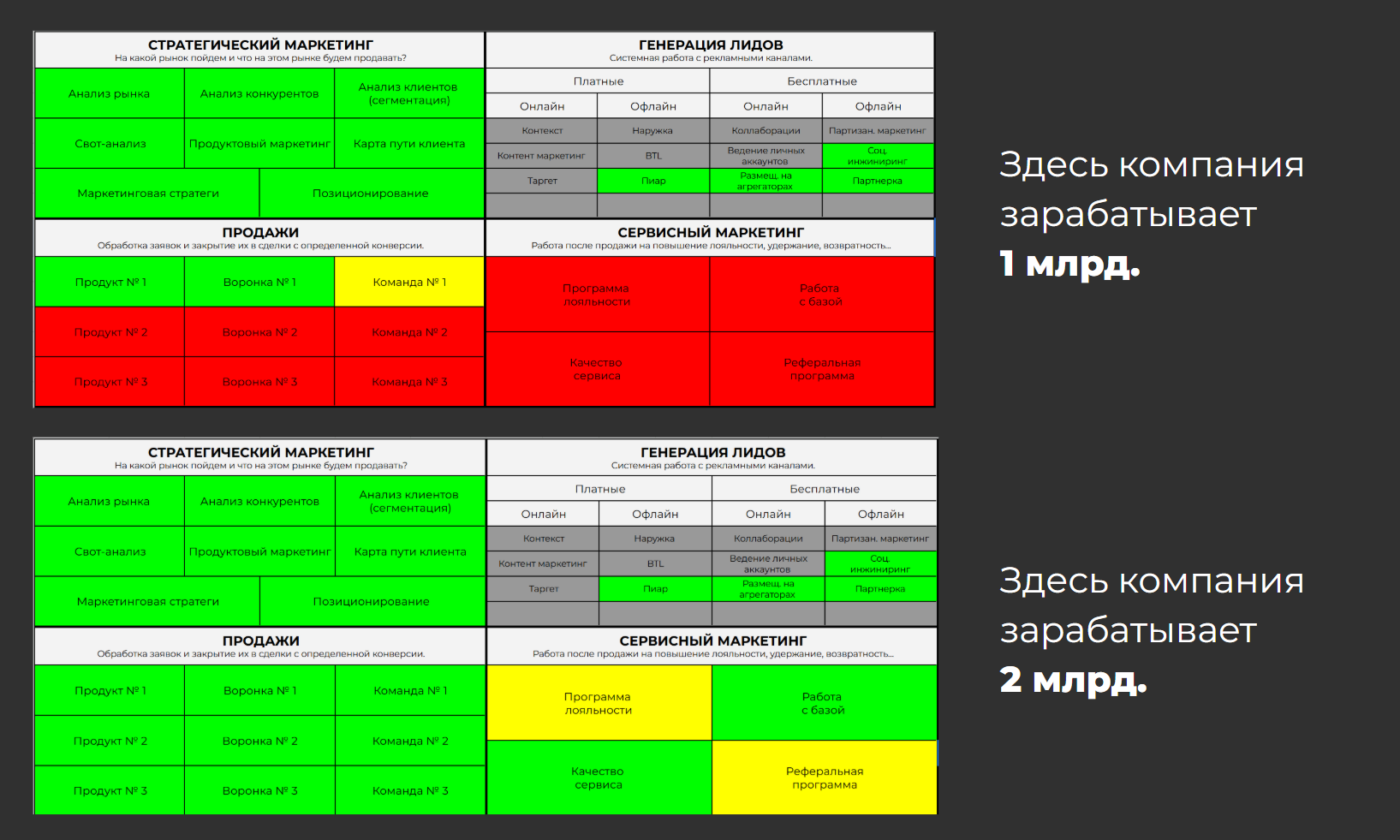2. Если маркетинговая система развита здоровой, то бизнес растёт системно из года в год, и он стойко переносит кризисные периоды на рынке. Если маркетинговая система нездорова или не развита, то бизнес стагнирует или растёт крайне медленно.