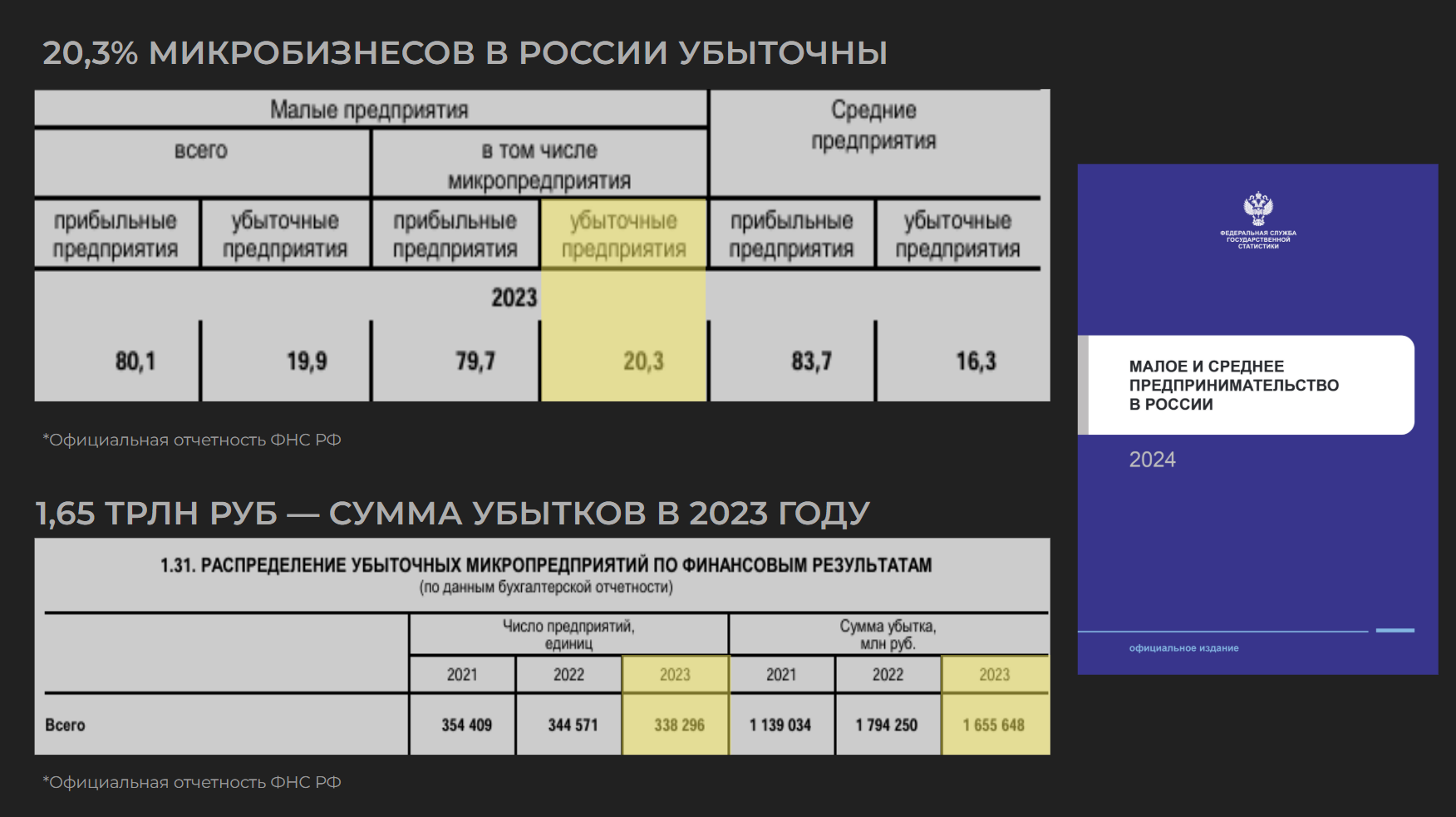 По данным ФНС, в 2024 году было ликвидировано 1 млн микробизнесов. Каждые 1,5 из 10 закрываются. 20,3% микробизнесов убыточны. А общий долг микрокомпаний за 2023 год — 1,65 трлн руб.